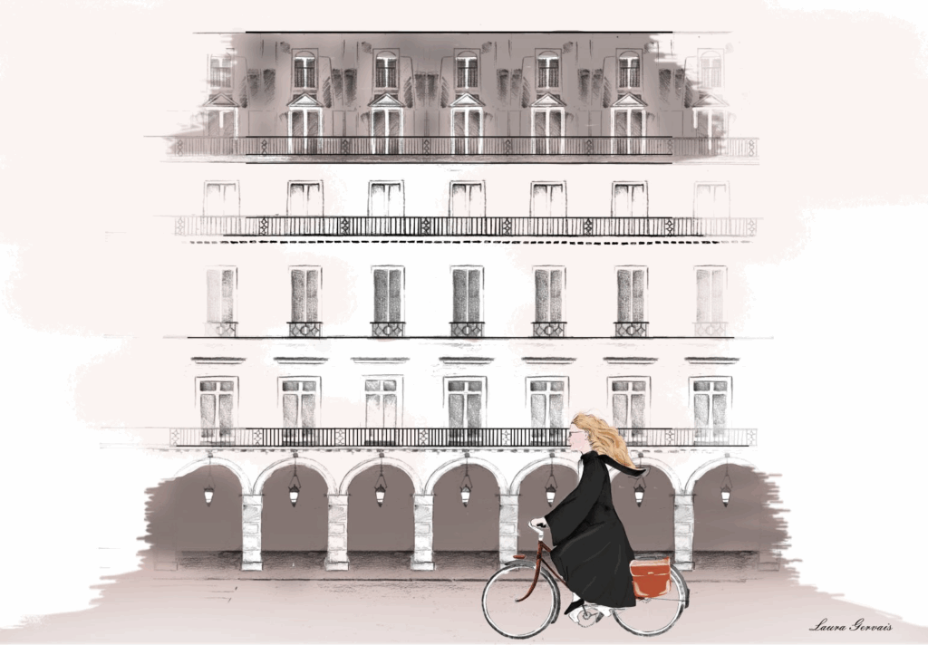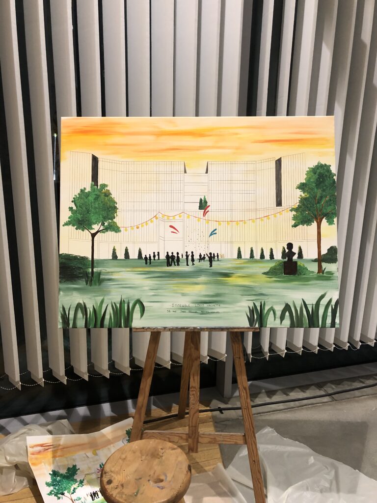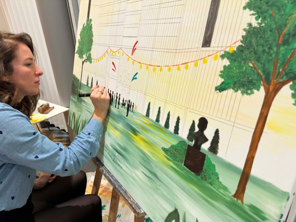 L’artiste a choisi de représenter le bâtiment côté jardin, offrant un angle plus original qui permet de voir la longueur de l’immeuble. Pour refléter le côté festif de la soirée, de petits personnages ont été ajoutés à l’intérieur et à l’extérieur, accompagnés de guirlandes de type guinguette, dans une ambiance fin de journée et coucher de soleil. L’espace est ainsi animé, tout en restant figuratif.
