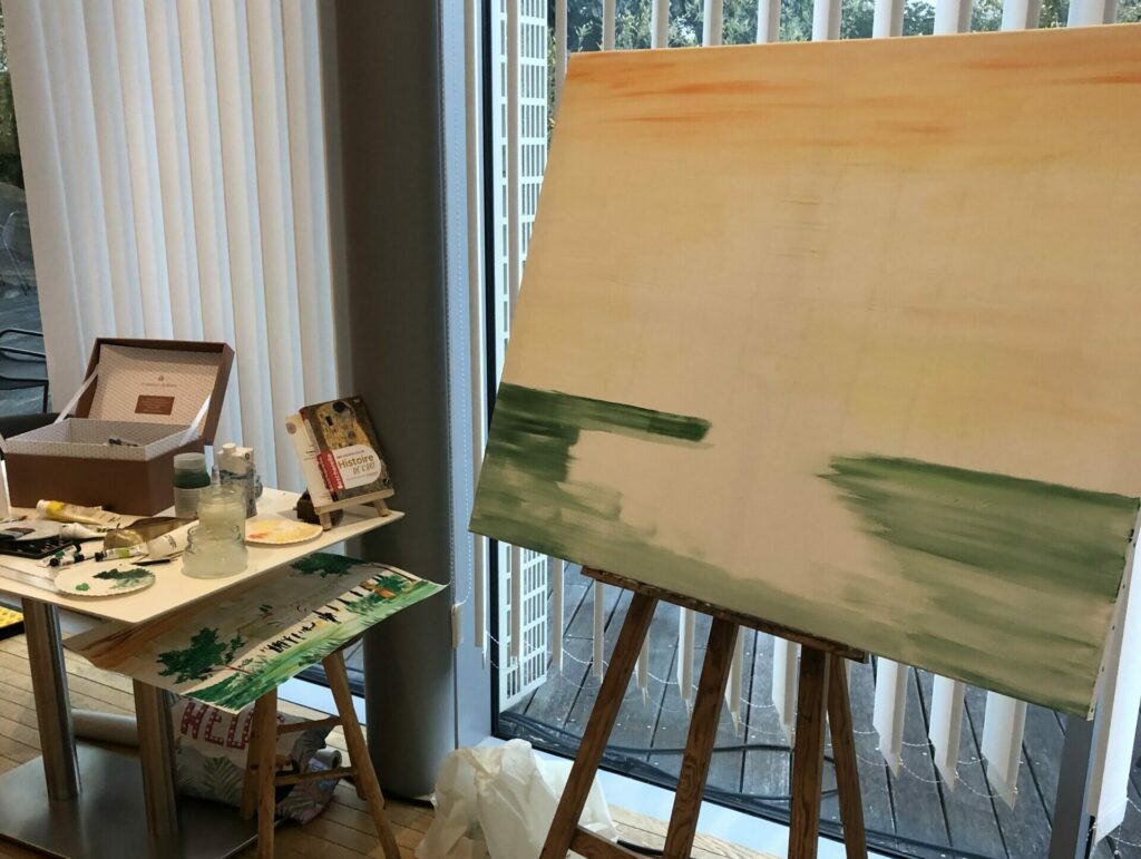 Sa palette, subtile et harmonieuse, joue un rôle central dans ses créations. Les touches de beige et d’orange, en particulier, apportent chaleur et convivialité à ses œuvres, tout en évoquant la mémoire des lieux et des instants partagés.